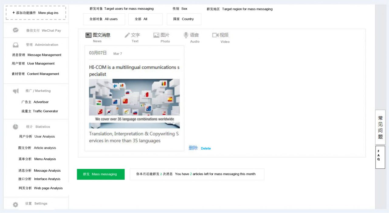 Step 3: Write your article for Wechat account and save it by clicking on “Save and Mass Messaging”.